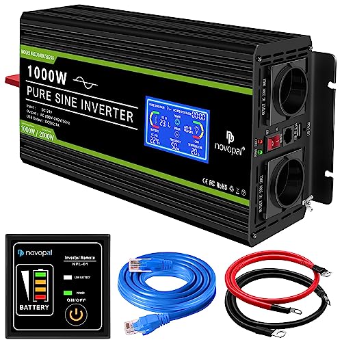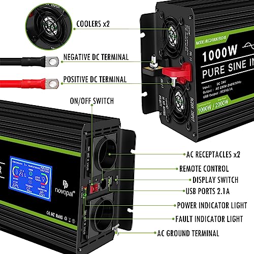 [Inverter NOVOPAL: convertitore di tensione a onda sinusoidale pura con 1000 W CC, 24volt a 220/230 V CA, potenza di picco fino a 2000 W, 2 prese CA, porte USB 2,1 A, telecomando e 2 ventole.