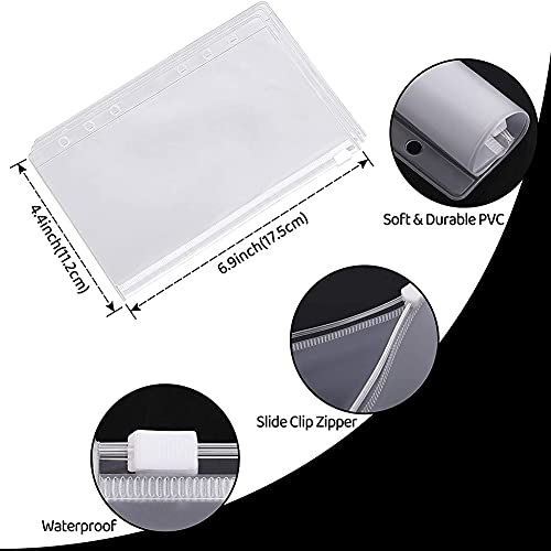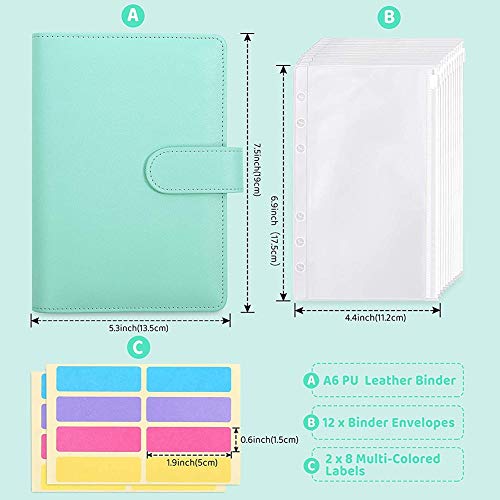 Conveniente: 1 raccoglitore A6 in pelle PU, 12 buste A6 chiusura a zip, 16 etichette autoadesive autocromatiche per organizzare monete, spese e risparmi.