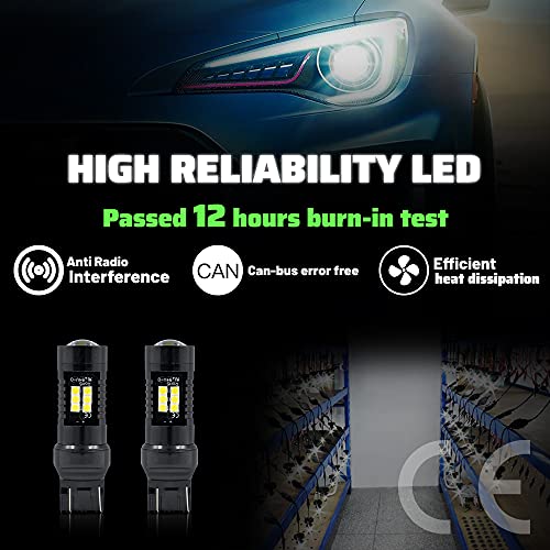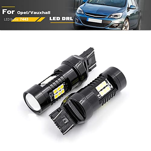 Alta luminosità: Ogni lampadina a led 7443 con lente del proiettore per il 2009-2018 Opel/Vauxhall Astra J DRL luce di marcia diurna è dotata di 21 chip LED ad alta potenza 3030SMD, con potenza nominale 21W (MAX) e potenza di lavoro 5W, illuminazione estremamente luminosa a 360 gradi.