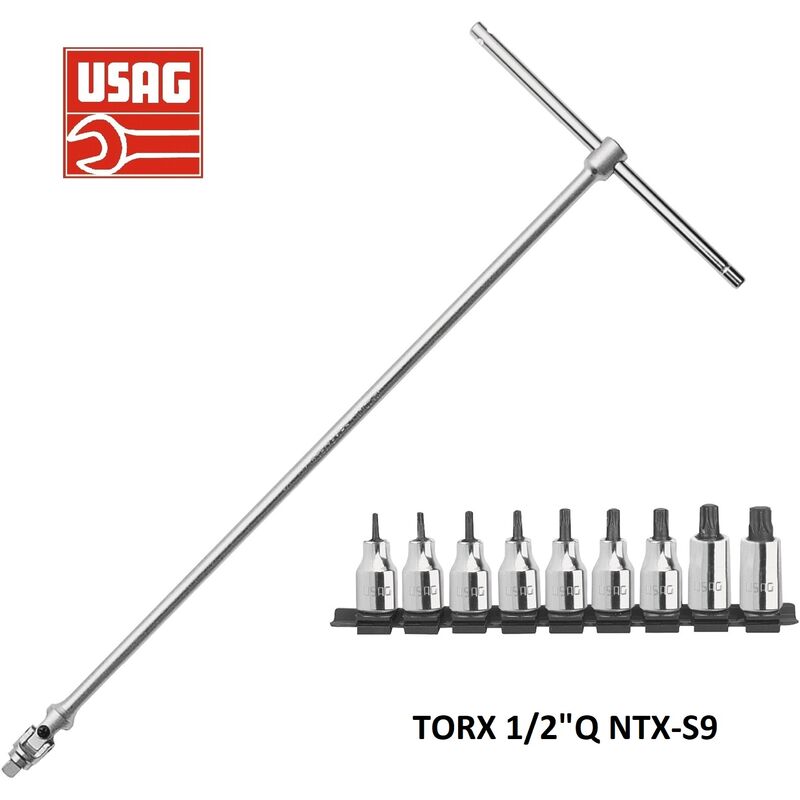 USAG 273 1/2 Q NTX/S9 CHIAVE A T SNODATA SERIE 9 CHIAVI A BUSSOLA TORX MASCHIO INCLUSO NEL SET 9 - 233 1/2 NTX CHIAVI A BUSSOLA PER VITI CON IMPRONTA TORX MISURE - T20-T25-T27-T30-T40-T45-T50-T55-T60 1 - 273 1/2 Q CHIAVE A T CON ATTACCO QUADRO SNODATO DESCRIZIONE Chiavi a bussola per viti con impronta TORX 233 1/2 NTX Acciaio speciale altamente legato al Cromo Molibdeno Esecuzione cromata Chiave a T con attacco quadro snodato 273 1/2 Q Modello a snodo cardanico con molla di frizione per consentire il preposizionamento della bussola con l'inclinazione desiderata Asta di manovra scorrevole ed estraibile Acciaio speciale altamente legato al Cromo Vanadio Esecuzione cromata