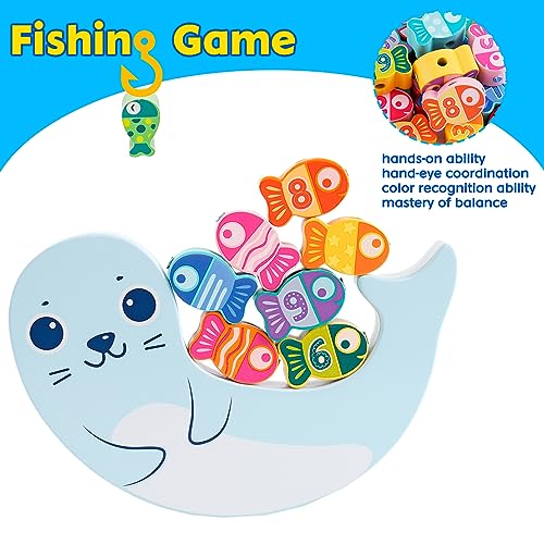 Giocattoli montessori in legno: il materiale è realizzato in legno, più ecologico e sicuro. La superficie è liscia e priva di sbavature, tra cui 18 pesci 3D, un delfino e due canne da pesca. Miglior regalo di Natale, compleanno, festa per bambini dai 2 ai 4 anni per ragazzi e ragazze.