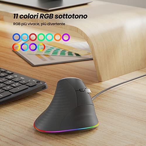 Nulea Mouse Verticale Cablato, Mouse Ottico Ergonomico USB Con 4 DPI Regolabili, 11 Modalità di Retroilluminazione RGB, Compatibile Con Laptop, PC, Desktop, Mac, Grigio