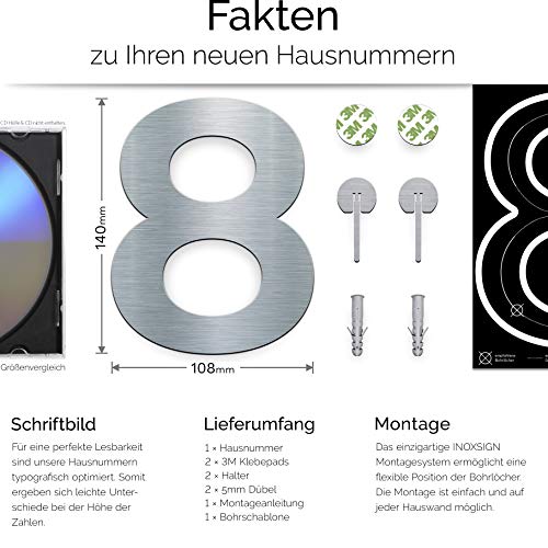 ⭐ SPECIFICHE TECNICHE - Altezza del numero civico: 140 mm, spessore del materiale: 1 mm (ECO) o 2 mm (SOLID) - CONSEGNA: 1 numero civico (V2A), 2 ancoraggi di fissaggio (V2A), 2 tasselli, 2 cuscinetti adesivi, 1 istruzione di montaggio, 1 dima SUGGGERIMENTO - Prima incollare la dima sul luogo dove si desidera montare il numero civico. Questo permette di giudicare da diverse posizioni se è la posizione "migliore" per il montaggio del numero.