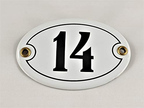 Numero civico smaltato n. 14, ovale, bianco e nero, realizzato a mano