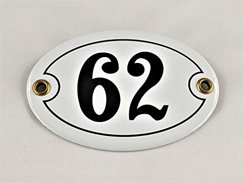 Numero civico smaltato n. 62, ovale, bianco e nero, con viti e tasselli, realizzato a mano