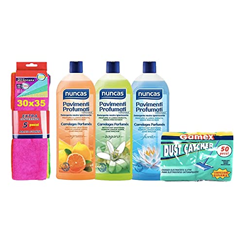 NUNCAS KIT PAVIMENTI PROFUMATI: ZAGARA 1LT+ AGRUMI 1LT+ FIORITO 1LT + GAMEX 50 panni pavimento elettrostatici cattura polvere 22x29cm + pacco 5 panni in microfibra 30x40cm