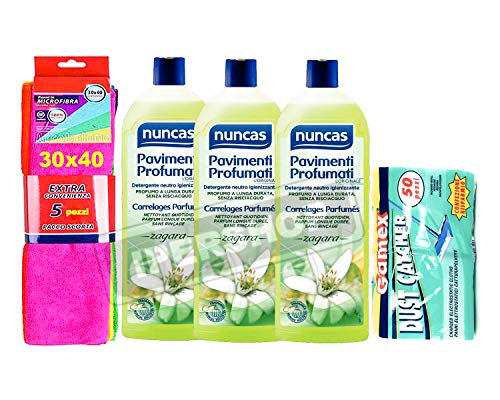 NUNCAS SET 3 PZ PAVIMENTI PROFUMATI ZAGARA 1 LT + GAMEX 50 PANNI CATTURA POLVERE+pacco scorta 5 panni in microfibra 30x40cm