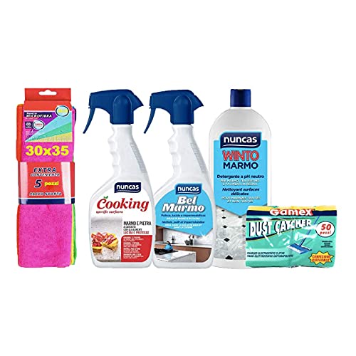 NUNCAS SET PULIZIA MARMO - COOKING MARMO E PIETRA 500 ML + BEL MARMO 500 ML + WINTO MARMO 1 LT +GAMEX 50 panni pavimento elettrostatici cattura polvere 22x29cm + pacco 5 panni in microfibra 30x40cm