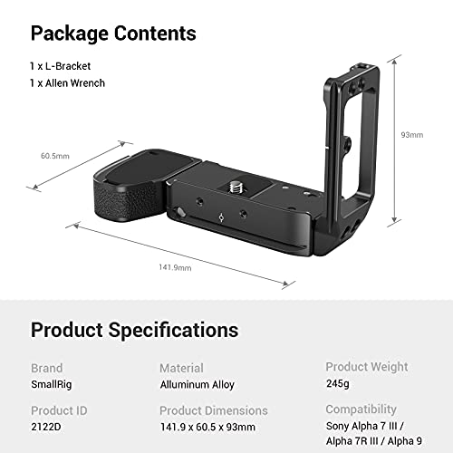 【NUOVA VERSIONE 2122D】La SMALLRIG L Bracket 2122D è progettata specificamente per Sony A7III // A7RIII / A9. Con il design anti-torsione, non si muoverà più. Dispone inoltre di imbottitura in morbida pelle sulla parte dell'impugnatura per un maggiore comfort. Un cacciavite a testa piatta è attaccato sul lato per l'installazione.