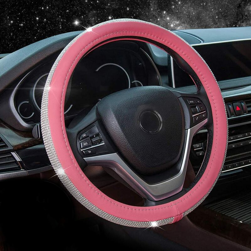 Materiale del coprivolante in cristallo: pelle PU di alta qualità e tecnologia top diamond: è più stabile di altri prodotti simili e non ti farà male alle mani. Questo coprivolante da donna Bling è adatto per volanti con un diametro di 37-38 cm/14,5-15 pollici. Il design del coprivolante a diamante alla moda e affascinante lampeggia sotto la luce: risplende attraverso il parabrezza per illuminare la tua auto. Regalo perfetto per donne e ragazze. Tocco eccellente: lo strass di cristallo massaggia il palmo della mano, allevia l'affaticamento della guida e ti offre un tocco eccellente. Facile da installare: Questo coprivolante in pelle PU deve essere installato facilmente. Basta farlo scorrere direttamente sul volante. Basta posizionare il coperchio sulla parte superiore del volante. Tieni premuta la parte superiore del coperchio, quindi abbassa gradualmente entrambi i lati con entrambe le mani per stringerlo.