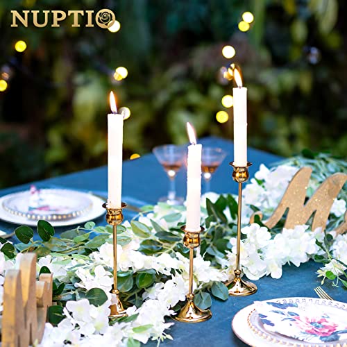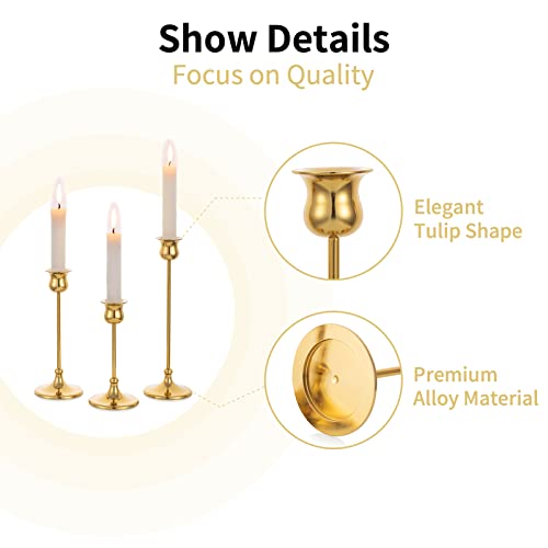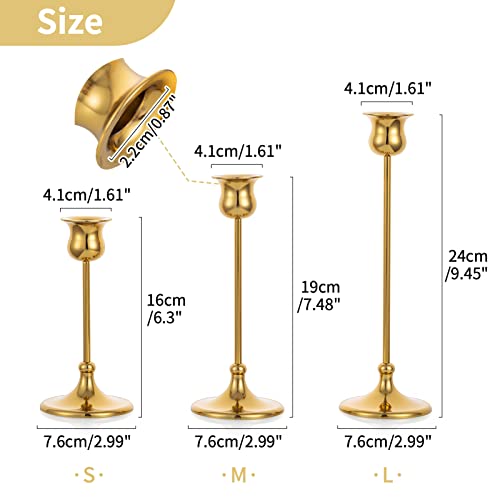 PORTACANDELE DI DIMENSIONI PERFETTE: portacandele dorati per candele a candeliere, di cui 3 diverse altezze: 16cm/6.3", 19cm/7.5'', 24cm/9.4''. I portacandele in metallo a una testa sono ideali per aggiungere un'eleganza senza tempo alla mensola del camino, al camino, scaffale, tavola da pranzo o evento speciale.