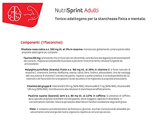 PERCHÉ NUTRISPRINT. Unico energizzante in flaconcini che contiene 200 mg di Rhodiola rosea titolato al 3% in rosavine come da Monografia Europea, associato a principi attivi ad azione ergogenica. La vitamina B1 è coinvolta nel metabolismo dei carboidrati, la vitamina B6 nel metabolismo proteico.