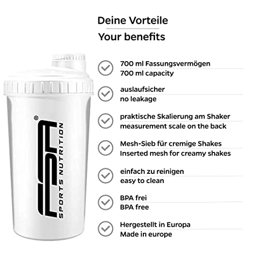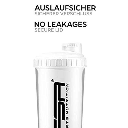 FSA Nutrition Shaker per Proteine 700 ml del marchio sportivo professionale scala di misurazione e tappo a vite, per frullati dietetici e proteici, privo di BPA - Bianco