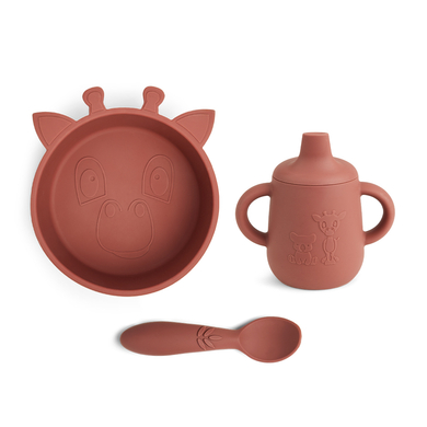 Dettagli del prodotto: Il giocoso set di stoviglie per bambini Judi è composto da un piatto fondo, una ciotola e un cucchiaio. Simpatico motivo a giraffa Il silicone è morbido e pratico, in quanto lavabile in lavastoviglie e non si rompe in caso di caduta a terra. Design Elias Mogano Materiale e dimensioni: Tutti e tre i pezzi sono realizzati in silicone certificato LFGB e sono privi di sostanze chimiche nocive. Istruzioni per la conservazione e la cura: Il silicone è adatto agli alimenti, alla lavastoviglie e al microonde. La fornitura comprende 1 x piatto fondo 1 cucchiaio 1 x tazza con attacco a becco