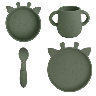 Dettagli del prodotto: Design: Dusty Green Set di 4 pezzi in silicone con piatto, piatto fondo, tazza e cucchiaio. Tutti e quattro i pezzi sono realizzati in silicone certificato LFGB senza sostanze chimiche nocive. Il silicone è morbido e quindi pratico, in quanto non si rompe in caso di caduta a terra. Materiale e dimensioni: Silicone LFGB senza sostanze chimiche nocive Altezza: 19 cm x larghezza: 17 cm x lunghezza: 8 cm Istruzioni per la conservazione e la cura: Lavabile in lavastoviglie Incluso nella consegna: 1x piastra in silicone 1x piastra profonda in silicone 1x tazza in silicone 1x cucchiaio in silicone