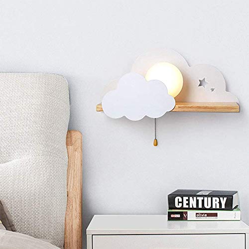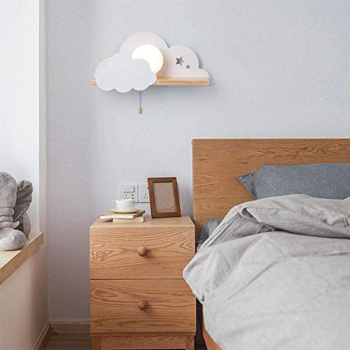 Nuvola Lampada da Parete Bambini Cameretta con Interruttore Metallo Bianco Freddo Applique da Parete Interno Legno e Ferro Vetro Paralume Luce da Comodino Illuminazione Muro Moderno Camera Letto E27