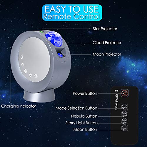 【Proiettore Luce Galassia 3 in 1】Il proiettore luce stellare combina stelle, luna e nebulosa. Tre effetti di proiezione possono funzionare congiuntamente o disgiuntamente. Lei può scegliere e combinarli liberamente per creare una atmosfera di proiezione spaziale romantica e screziata nelle camere da letto, da gioco e nel teatro di casa.