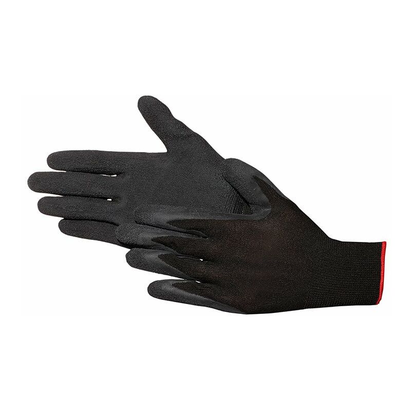 Poliammide nylon fine maglia nera rivestimento in lattice su palmo e dita, ottima sensazione al tatto, vestibilità eccellente, ottima vestibilità, antiscivolo, non lascia pelucchi, senza cuciture, calibro 13, conforme alla norma EN 388