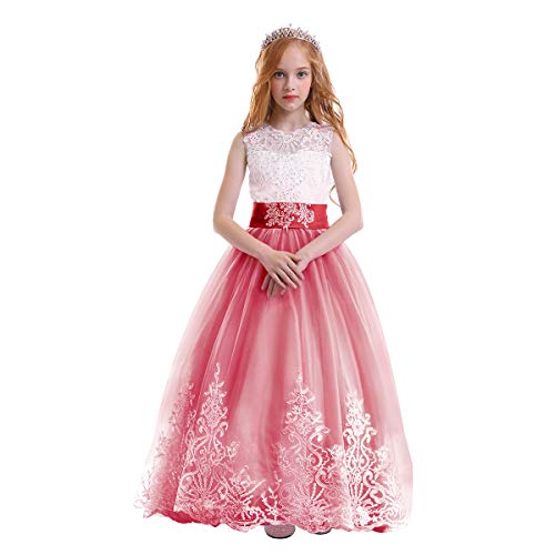 OBEEII Bambina Maxi Abito in Pizzo Floreale con Strass Senza Maniche Elegante Vestito da Principessa Cerimonia Sera Sposa Prima Comunione Damigella Bambina Cocktail Prom 10-11 Anni Rosso