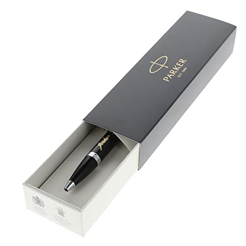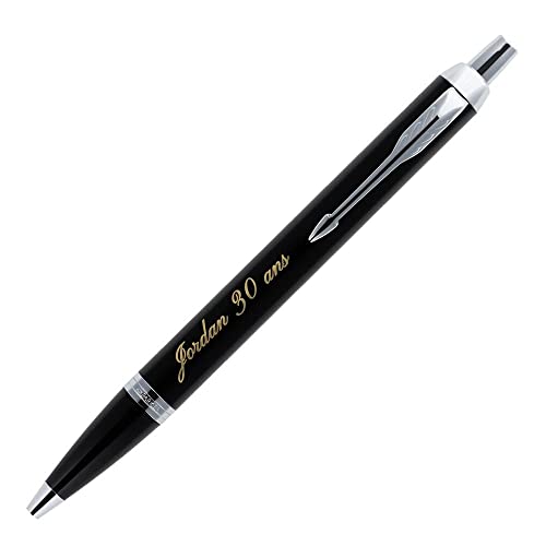 IM Parker biros in nero lucido. Biros con inchiostro blu e finiture in argento cromato. Incisione del testo su questa penna nera