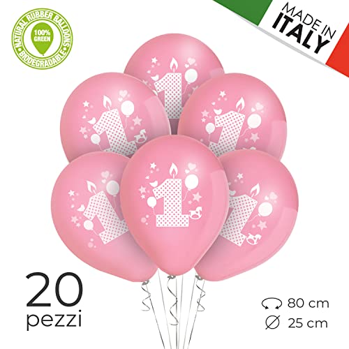 Ocballoons 20 Palloncini 1° Primo Compleanno Bimba Rosa Biodegradabili Lattice Made in ITALY Addobbi e Decorazioni Kit per Feste Bambina Gonfiabili con Bombola Elio Baby Shower