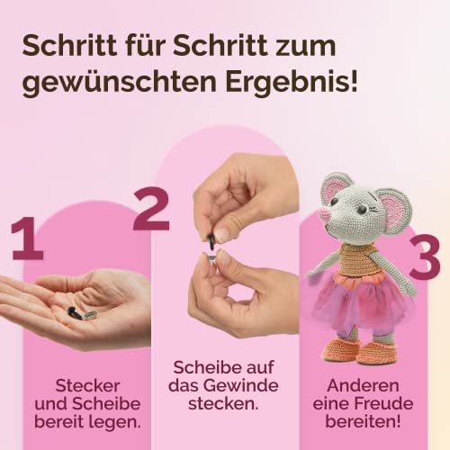 Maneggevolezza: gli occhi di peluche vengono consegnati con una rondella. Ciò impedisce che gli occhi si allentino e garantisce quindi una presa salda.