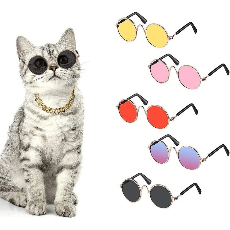 Materiale di alta qualità: gli occhiali da sole per animali domestici sono realizzati con montatura in metallo e lenti in resina. Sono molto sicuri, affidabili e durevoli. L'animale è comodo da indossare e può essere utilizzato a lungo. 5 colori Gli occhiali da sole Pet sono disponibili in 5 diversi colori, che possono essere abbinati a diversi stili di abbigliamento. Se vuoi uno stile alla moda. Corda antiscivolo: la larghezza appropriata degli occhiali lo rende più comodo da trasportare per cani e gatti. Il design della lente rotonda degli occhiali da sole per animali domestici rende il tuo animale domestico elegante e carino. Con una corda antiscivolo, il tuo animale domestico durerà per sempre e godrà del comfort offerto da questi occhiali da sole rotondi. Classico e retrò: la combinazione di montatura in metallo e lenti in resina AC degli occhiali da sole per animali domestici conferisce a questi animali domestici occhiali da sole un look molto classico e organizzato. È semplice