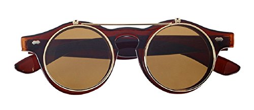 Occhiali da sole rotondi steampunk flip up doppia lente hipster con bacchetta (marrone)