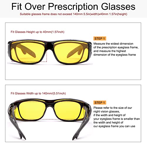 ▶ ADATTA SOPRA GLI OCCHIALI : Questi occhiali per la visione notturna sono appositamente progettati per coloro che indossano occhiali da vista (lunghezza della montatura entro 5,51 pollici e altezza della cornice entro 1,57 pollici), le persone indossano lenti a contatto o con una visione normale possono anche indossarli da soli. Questi occhiali per la guida notturna si adattano comodamente alla maggior parte degli occhiali da vista di piccole e medie dimensioni.
