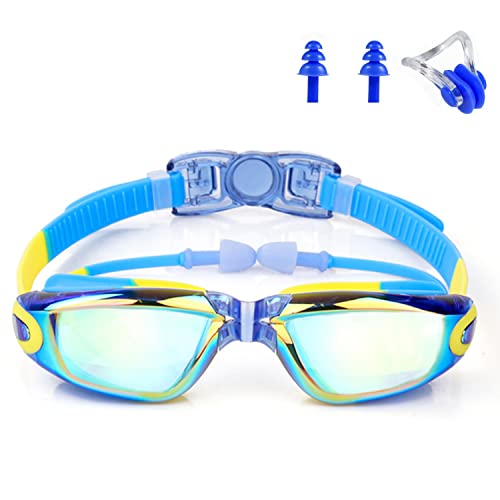Occhialini da nuoto unisex per adolescenti, anti-nebbia, protezione UV, confortevole snorkeling con clip per naso, tappi per le orecchie siamesi