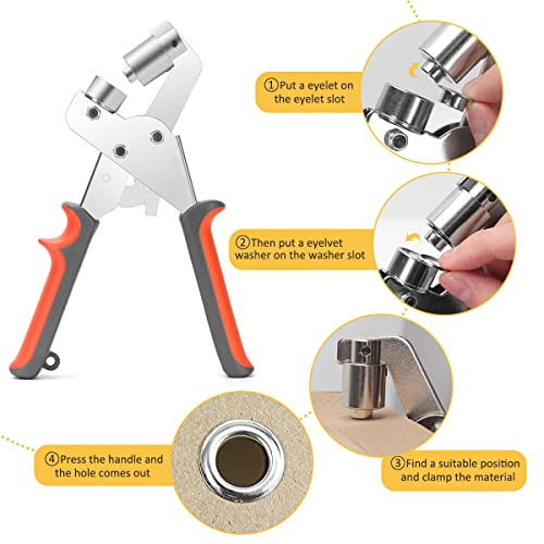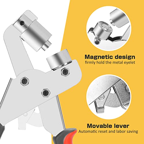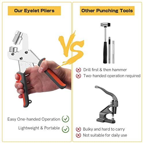 【Robusto e Durevole】-- Le pinze per occhielli sono realizzate in acciaio inossidabile e gomma di alta qualità, resistenti e non facili da arrugginire. Rafforzare la struttura del rivetto per rendere le pinze per occhielli più stabili e flessibili durante la perforazione.