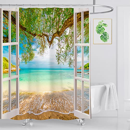 Informazioni di base: larghezza 180 cm x altezza 180 cm / 72 x 72 pollici. Ogni pacco include 1 tenda doccia e 12 ganci in plastica resistente. La stampa 3D design di onda mare verde acqua, sabbia beige, finestra luna, foglie di palme e tartaruga, rappresenta un tema tropicale della spiaggia dell'oceano blu.