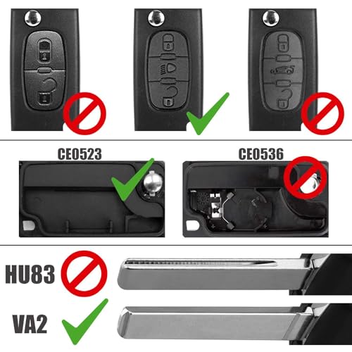 OcioDual Guscio Chiave Remota Telecomando a 3 Pulsanti Fari CE0523, con Lama VA2, Compatibile con Peugeot 206 207 306 307 308 407 607 806, Citroen C2 C3 C4 C5 C6, Key Case