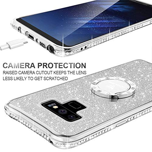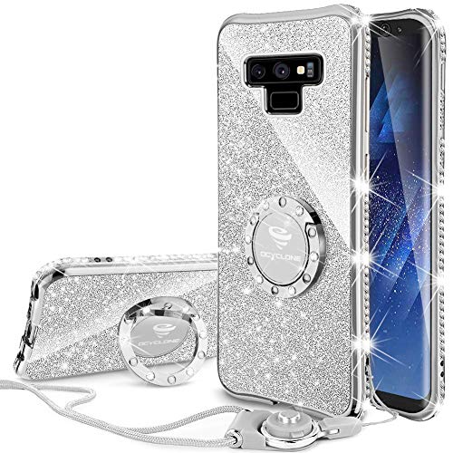 OCYCLONE Cover Galaxy Note 9, [1 Custodia + 1 Cordino] Glitter Bling Scintillante Brillantini Custodia con Ring Kickstand Rotante a 360 Gradi Donna Cover per Samsung Galaxy Note 9 - Argento