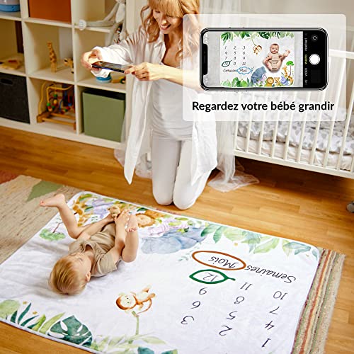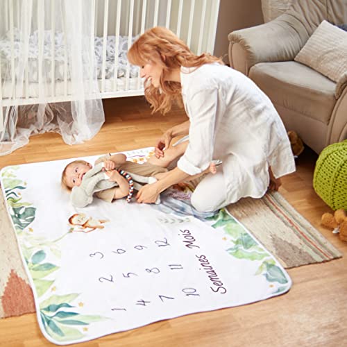 ODOXIA Coperta Mesi Neonato In Francese | Tappeto Mesi Neonato Per Maschio O Femmina, Unisex | Tema Safari | Regalo Baby Shower Personalizzato Per Neomamme | Copertina Mesi Neonato | Incluse Cornici