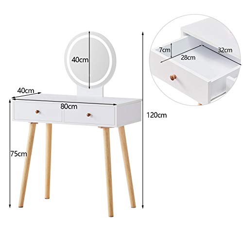 OFCASA - Tavolo da toeletta con luci a LED, specchio e sgabello, 2 cassetti, per camera da letto, 80 x 40 x 120 cm, colore: Bianco