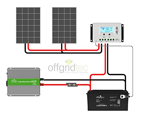 Cosa c'è dentro: 2 moduli solari OffGridTec con 150 W Dimensioni 1140 x 680 x 35mm^collettore di carica PWM 45A con display LCD trasparente, prese di ricarica USB e uscita di carico per i consumatori 12V^batteria AGM a prova di cicli e assolutamente manutentiva da 154Ah da OffGridtec^kit cavo professionale per una facile connessione^convertitore di tensione sinusoidale da 1500W (1500W 15min - 1200W permanente permanente - 2400W picco) per i tuoi consumatori 230V