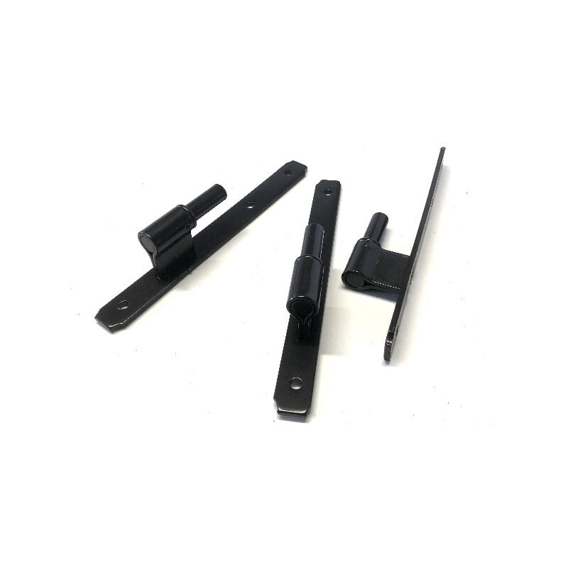 Cardine a legno per varvella e cantonali in ferro plastificato nero. Sezione piastra stretta mm.20x4, lunghezza cm.20 perno d.12 Altezza sottobandella mm.25.