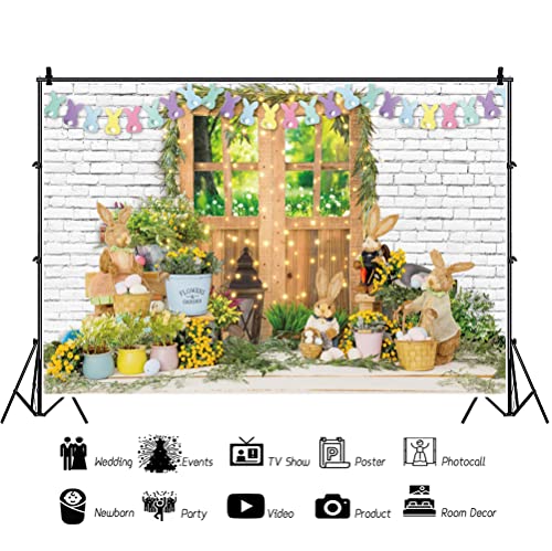 OFILA 2.2x1.5m Buona Pasqua Sfondo Muro di Mattoni Legno Tavola Porta Fotografia Sfondo Primavera Pasqua Fiore Foglie Verdi Sfondo Coniglietto Pasquale Sfondo Bambino Bambino Pasqua Photo Booth