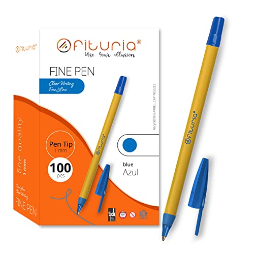 OFITURIA Penne a punta fine, colore blu, confezione da 100 pezzi, punta 1 mm precisione e dettaglio, ideali per diversi ambienti come ufficio, casa e scuola (scatola 100 pz.)