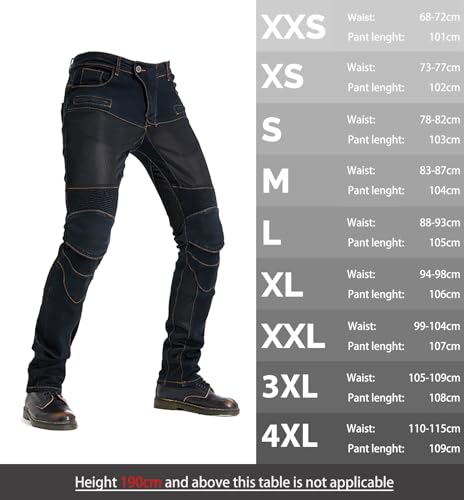 DESIGN ELASTICO: le parti del movimento articolare sono combinate con tessuto elastico e denim, è progettato ergonomicamente. Questi pantaloni moto uomo sono realizzati in 97% cotone + 3% elastan,che garantisce la massima elasticità e l'effetto dimagrire, rendendoti più flessibile ed elegante quando ti siedi sulla sella della moto, senza alcun senso di ritegno.