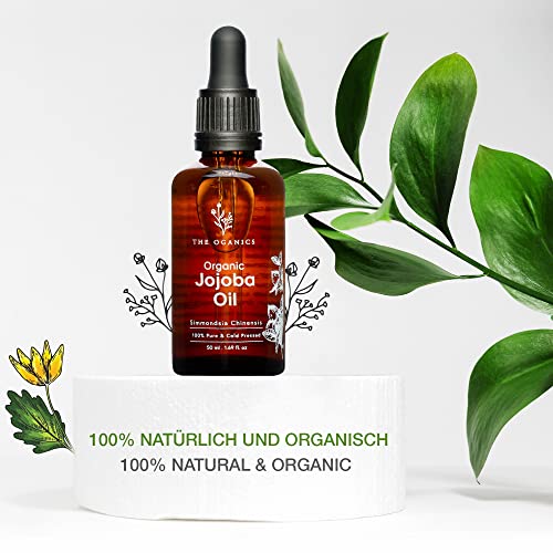 The Oganics Olio di Jojoba, 100% Puro Naturale e Spremuto a Freddo, Nutre e Protegge Pelle, Viso, Capelli e Unghie, Antietà, Vegano e Cruelty Free, Olio di Jojoba, Bottiglia di Vetro + Pipetta 50ml