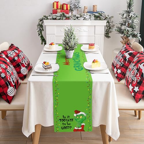 Ohok Runner da tavola natalizio per cucina, tavolo da pranzo, per soggiorno, fattoria, runner da tavola per feste e decorazioni per la casa (Grinch Is It Too Late yo Be Good)