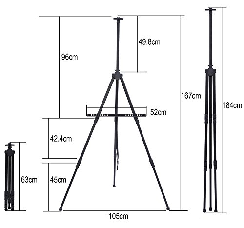 ❀* ALTEZZA ESTESA: 63-187cm: Questo cavalletto è regolabile senza fatica. Le gambe telescopiche possono essere regolate da 63 a 187 cm! Ogni gamba può essere regolata individualmente per donare una superficie piana, anche quando il terreno è sconnesso! Basta colo regolare la presa a molla e la leva di bloccaggio, ed il sostegno potrà tenere il tuo pezzo d'arte al suo posto