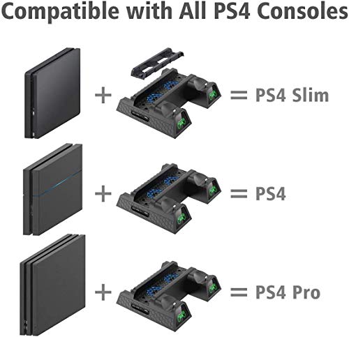 【ALL-IN-ONE Multifunction】supporto verticale per PS4 / PS4 Slim / PS4 Pro + 2 ventole di raffreddamento + stazione di ricarica a doppio controller + cavo USB + indicatori di ricarica LED del controller + 12 game storage