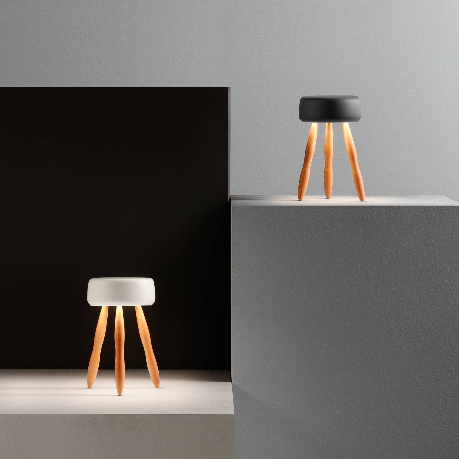 Lampada da tavolo Drum LED a batteria con struttura in legno e paralume che irradia dal basso Drum è un dispenser di luce supplementare decorativo che piace sul davanzale, sul comodino o sulla credenza con un design creativo, una luce piacevole e un tocco naturale. Il paralume rotondo è in metallo laccato e ospita un LED bianco caldo la cui luce viene emessa delicatamente verso il basso. Quando si aziona il dimmer a tre stadi sul lato inferiore, la temperatura del colore diminuisce con l'emissione della luce (dim-to-warm). Non è necessario un alimentatore durante il funzionamento, poiché la lampada da tavolo ha una batteria ricaricabile integrata (4.400 mAh), che si ricarica tramite ingresso micro USB (cavo incluso). Il telaio con tre gambe in legno di pero chiaro tornito fornisce il tocco naturale. La lampada da tavolo Drum è stata progettata da Marc Sadler, noto a livello internazionale per i suoi concetti innovativi in vari campi.