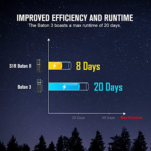 【Torcia Ricaricabile】La piccola torcia Baton 3 può fornire un'incredibile potenza massima di 1,200 lumen e un fascio di 166 metri. Dotata di batteria al litio ricaricabile, con cavo di ricarica magnetico MCC 1A.