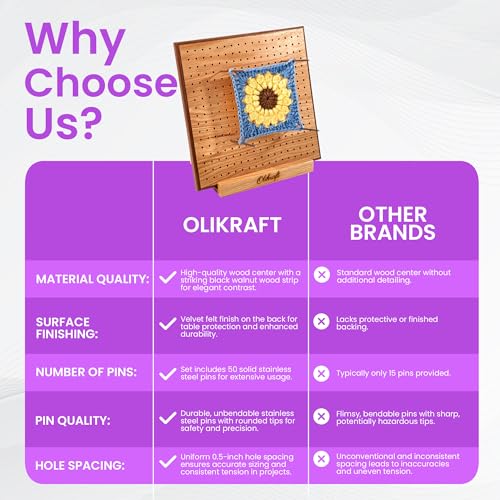 Olikraft Granny Square - Lavagna in legno con 50 perni di blocco e supporto, set di accessori per maglieria e uncinetto, ideale come regalo per uncinetto (35,6 cm)