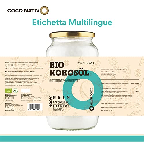 Olio di Cocco Biologico Extra Vergine CocoNativo -1000ml- Crudo e Spremuto a Freddo, Organico e Puro, Non Processato, (Bio Nativo), Ideale per Capelli, per il Corpo e ad Uso Alimentare, Non Raffinato