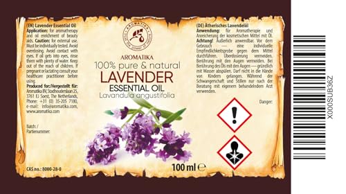 Olio Essenziale di Lavanda 100ml - Lavandula Angustifolia - Oli Essenziali per Aromaterapia - Oli Essenziali per Candele, Corpo, Capelli, Calmante - Aromi per Diffusori - Deodorante Armadio